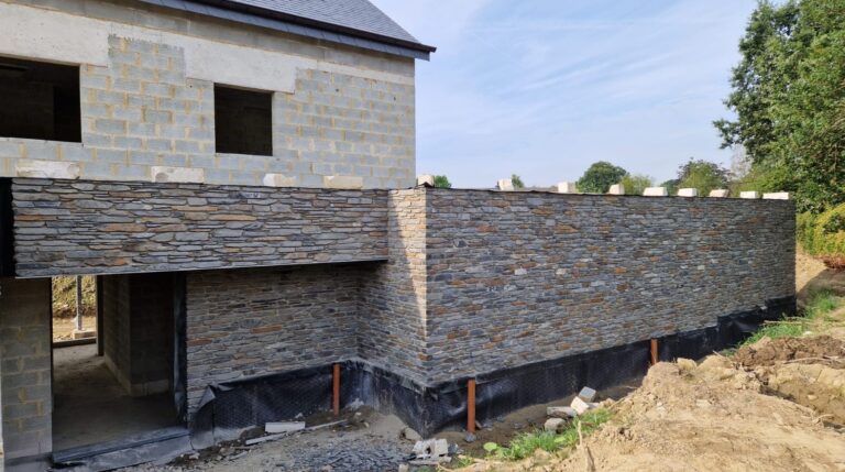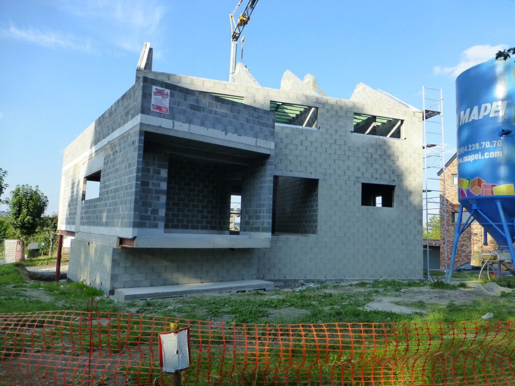 Les blocs utilisés sont des blocs de pierre ponce (Cogetherm), le mortier de maçonnerie est un mélange de poussière de pierre ponce et de chaux hydraulique. Tous les ferraillages, aussi rares qu’indispensables soient-ils sur ce chantier, ont été reliés à la terre.